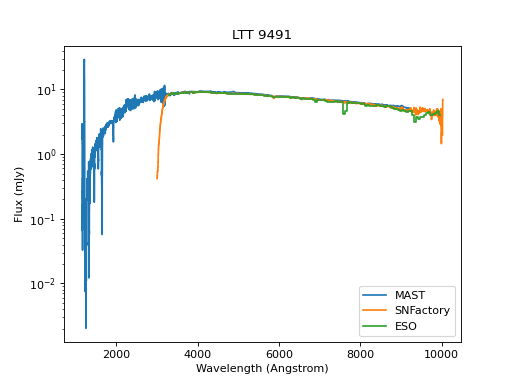 The MAST data have the best UV coverage, but that’s not useful from the ground and they only extend to 0.9 microns in the red in this case. The other data extend to 1.0 microns, but both spectra show systematics due to telluric absorption. The SNFactory data extend well past the atmospheric cutoff with no correction applied for atmospheric transmission. The ESO data, on the other hand, are not corrected for the telluric features in the near-IR while the SNFactory data are. Regions affected by such telluric systematics should be masked out before these spectra are used for calibration purposes.